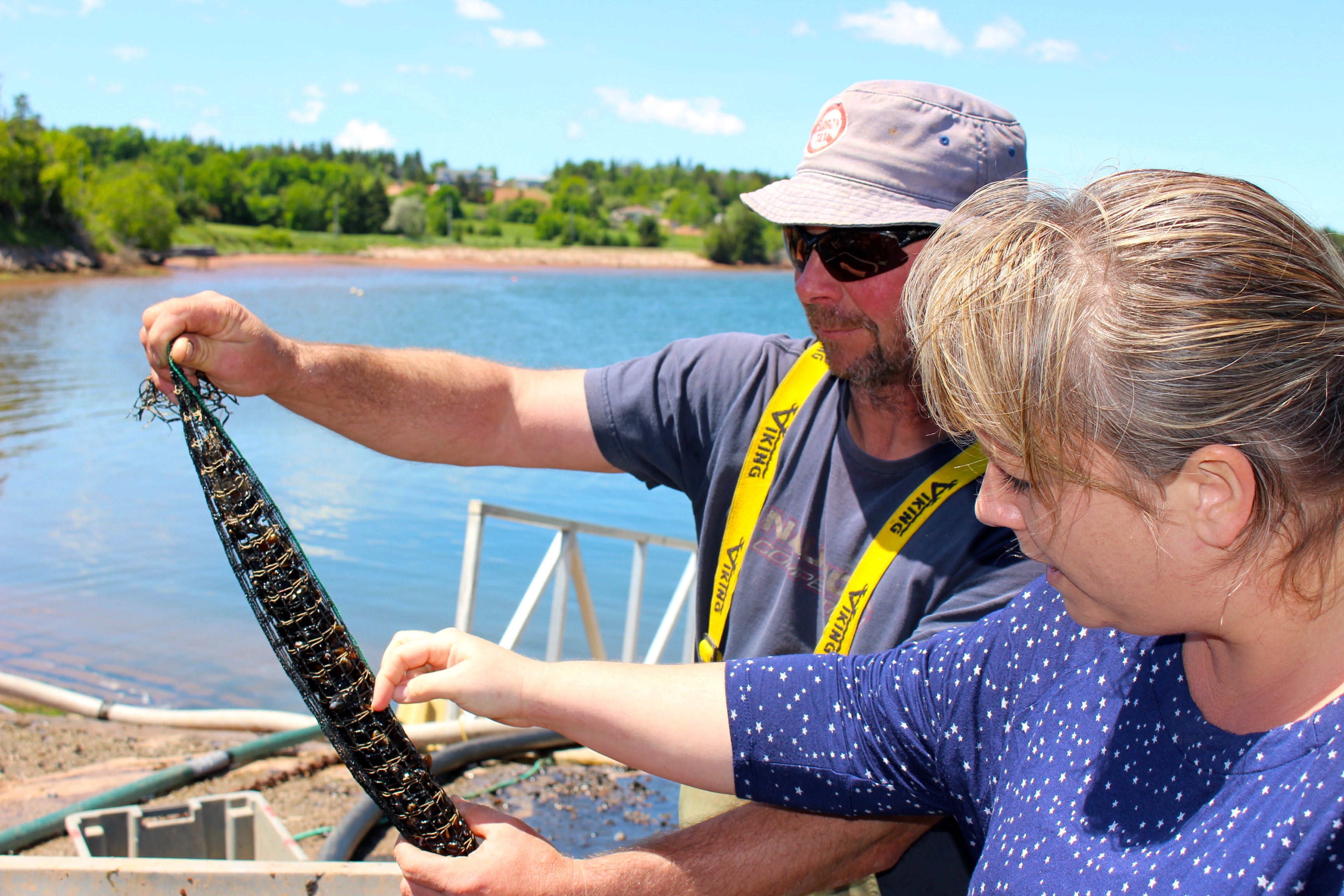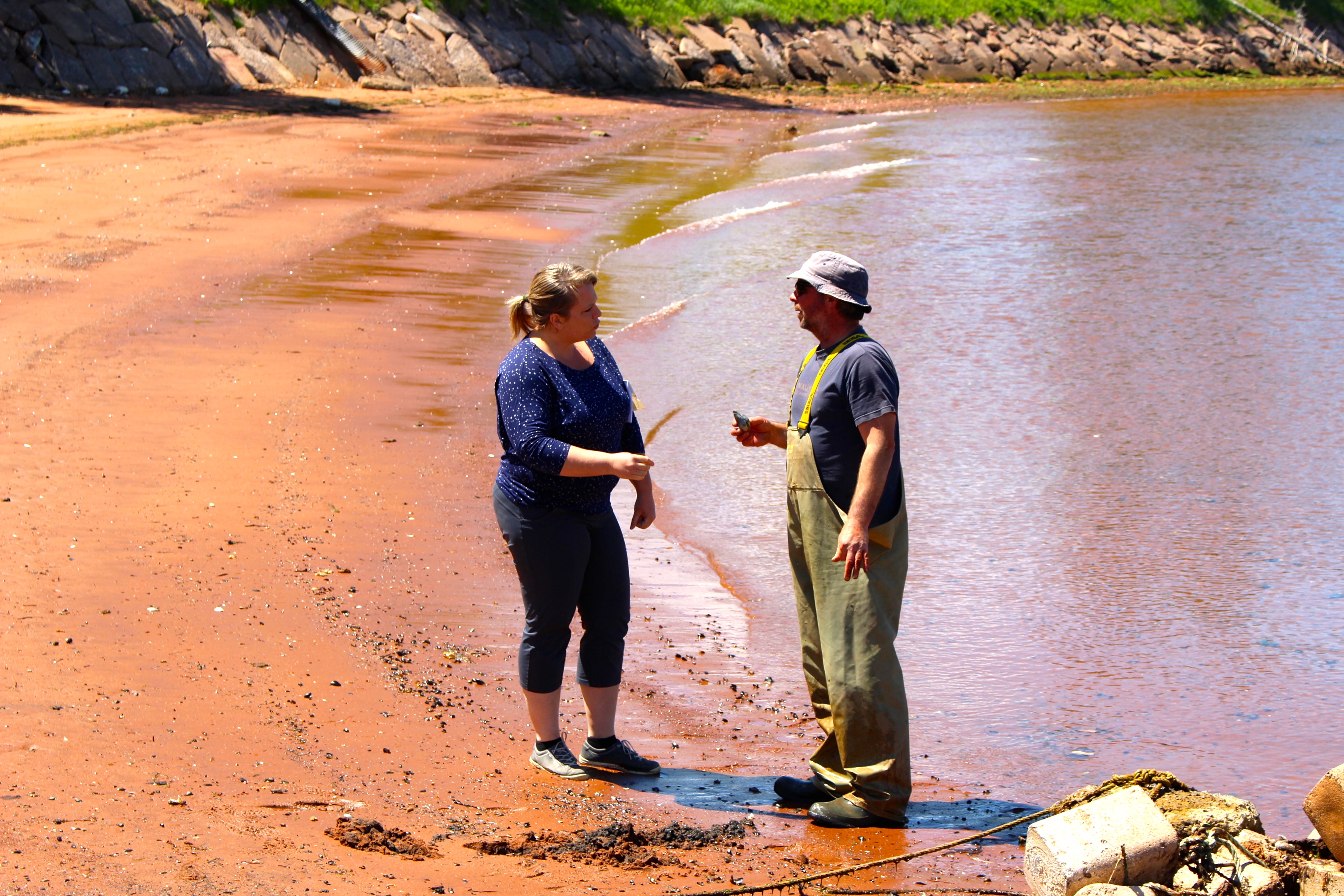 De passage à l’Office du tourisme, nous découvrons qu’il existe des excursions pour ramasser des fruits de mer, toutefois le prix est vraiment prohibitif. De ce fait, nous avons décidé de prospecter pour notre propre compte. Nous nous sommes rendus à Lower Montague sur une jetée où travaillait des pêcheurs. Là, nous avons rencontré Scott qui d’emblée nous a ouvert les bras ! Il s’est précipité sur la plage attenante est à expliqué à Anna comment prélever les coques sur la plage….