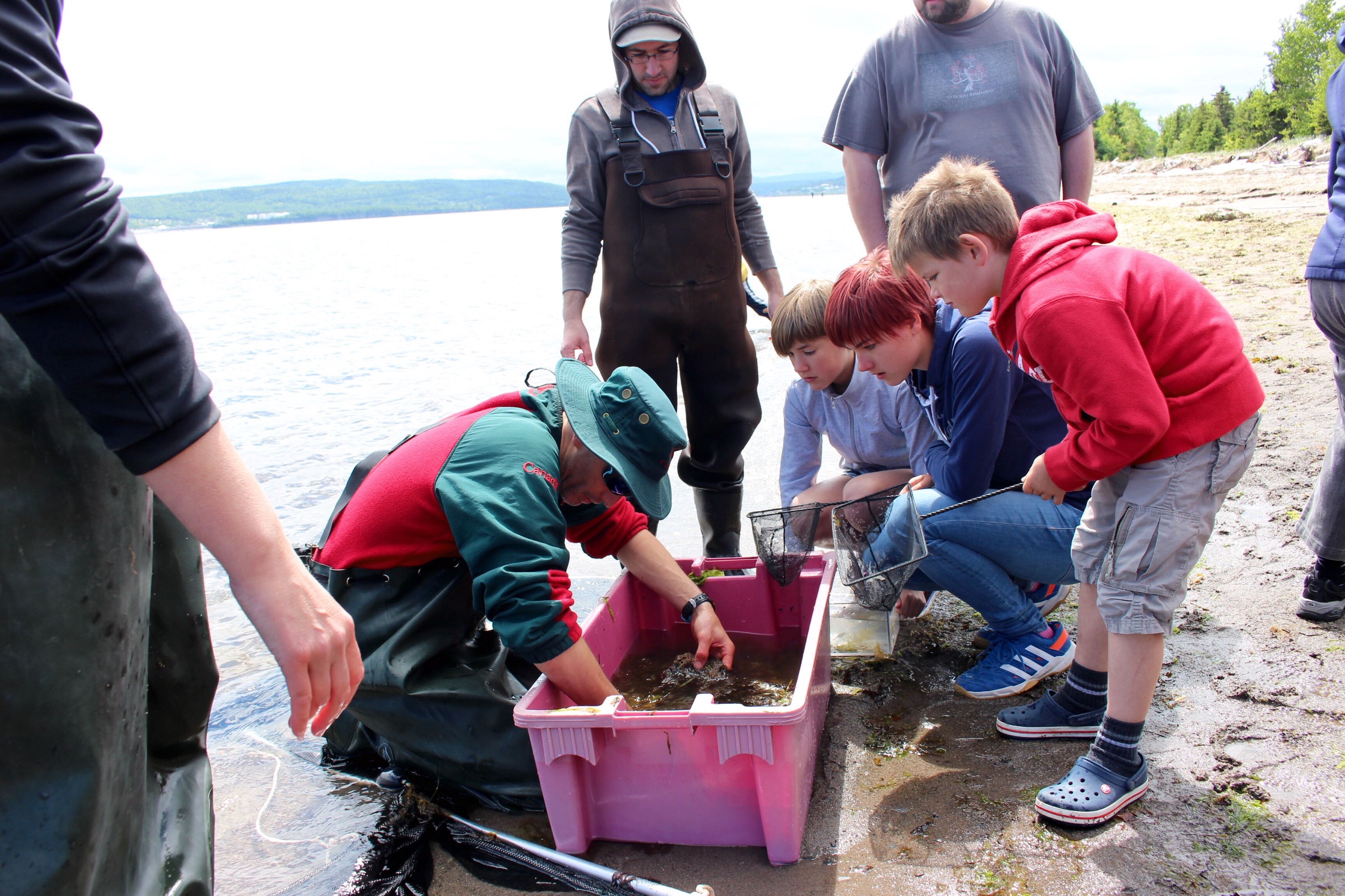 Sur une plage du parc national de Forillon les enfants participent à l’exploration des fonds marins, lesquels sont à notre grand étonnement fortement peuplés ! Epinoches, crevettes, morues, bébé moules sont au rendez-vous, très ludique ! Par la suite, nous nous sommes déplacés dans le parc pour contempler, avec un « ranger », les castors. Un moment magique à observer les traces d’ours, d’originaux et découvrir plusieurs castors en train de consolider leur barrage ! Même un serpent nous attendait tapis dans la verdure pour la plus grande frayeur des enfants…