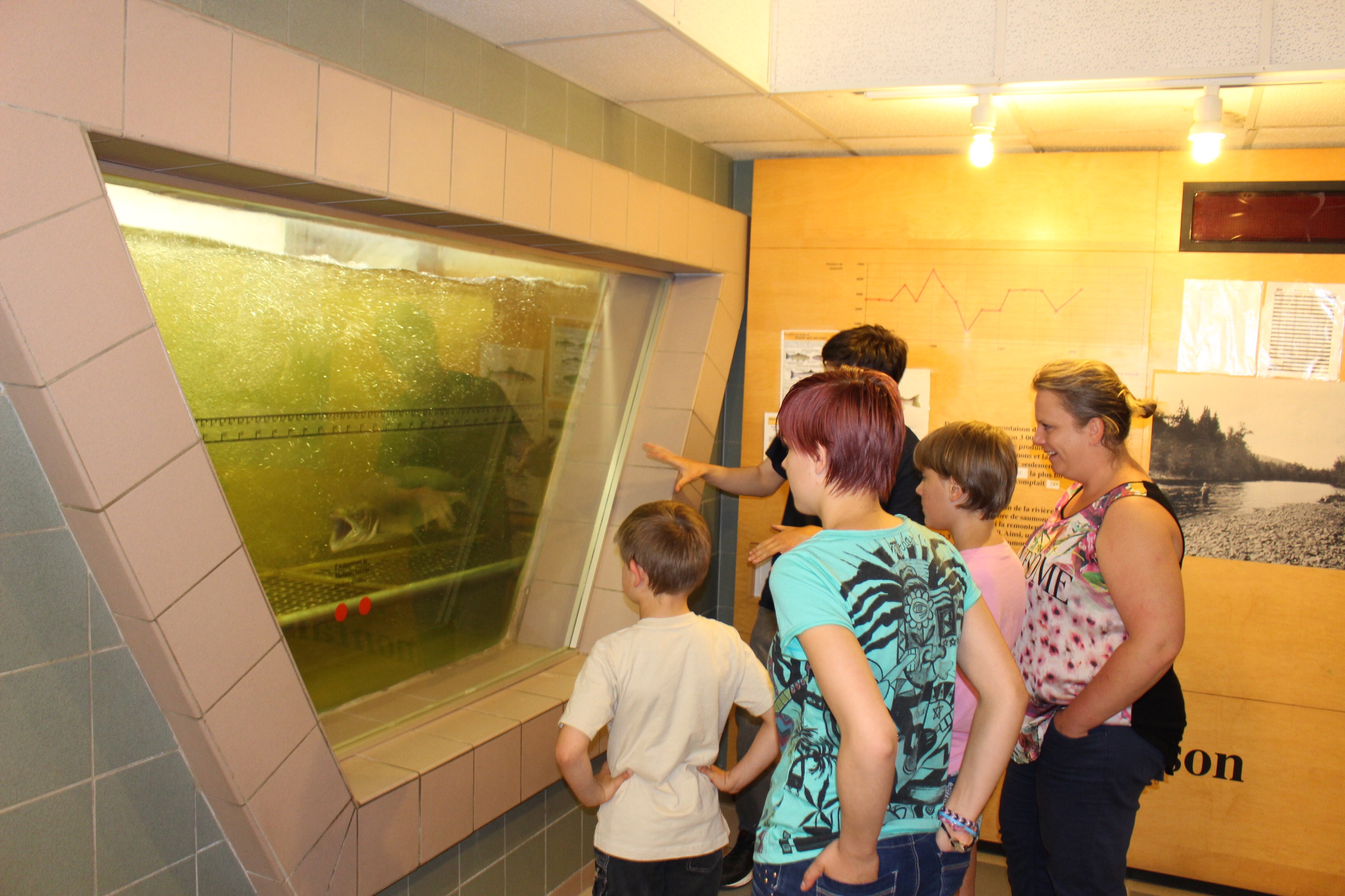 Nous nous rendons sur la rivière Matanne à un barrage, afin de suivre les saumons sauvages qui remontent la rivière. Pour ce faire, ils utilisent une sorte d’escalier à contre-courant. Nous sommes subjugués par la grandeur de ces poissons si communs dans nos assiettes. Le plus grand spécimen relevé à ce point de passage mesurait 1,22 mètres. Les bébés saumons naissent dans une rivière et arrivés adultes ils y retourneront toujours instinctivement pour se reproduire. Le mâle a ergot proéminent sur la mâchoire inférieure qui lui donne un air peu sympathique !