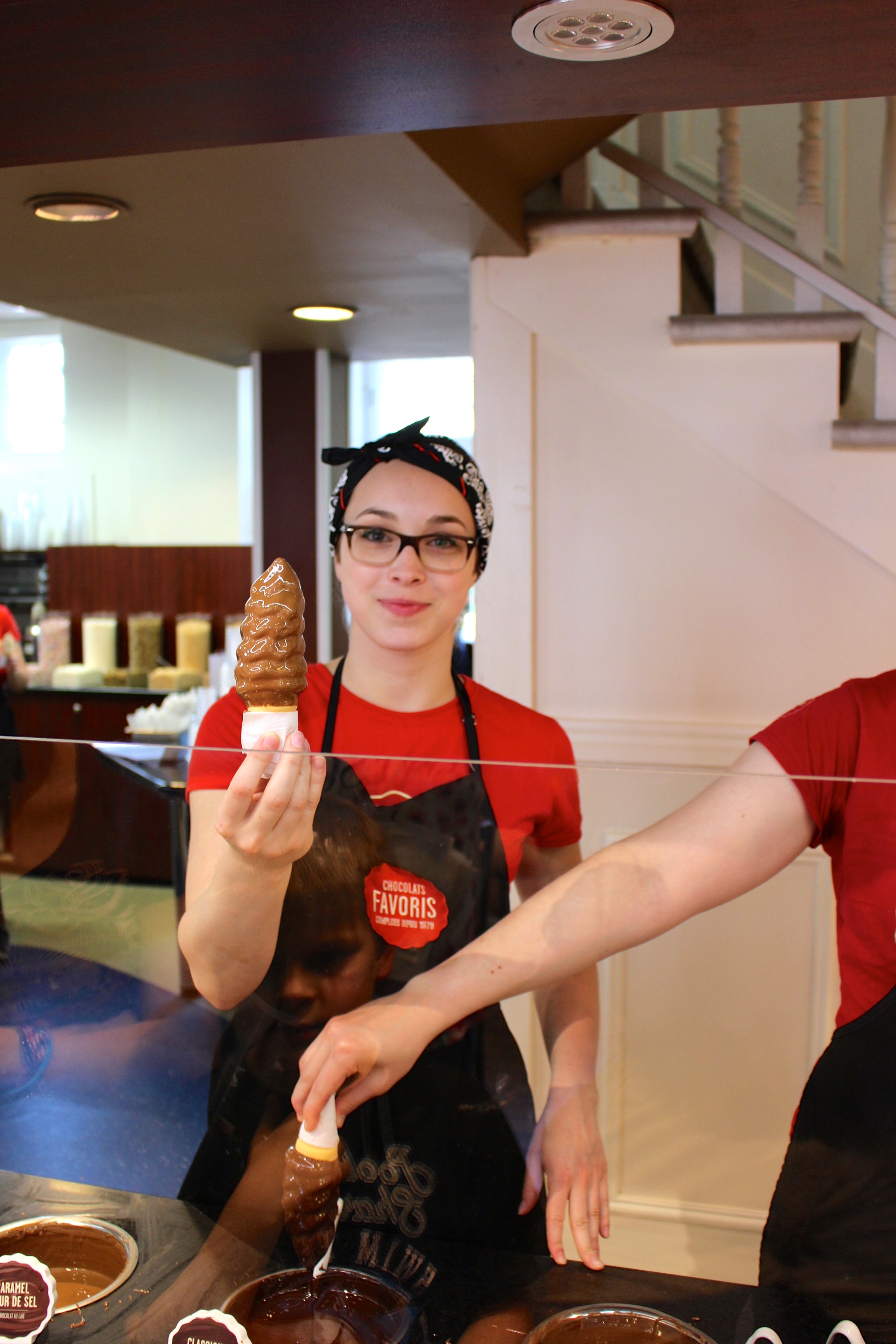 Ensuite, nous avons dégusté une « crème molle » trempée dans un enrobage chaud, une institution pour les québécois. D’ailleurs nous avons été impressionnés par la longueur de la file d’attente devant la boutique « Chocolats favoris ». Vous constaterez que nous avons été raisonnables car nous avons opté pour le format « mini »…