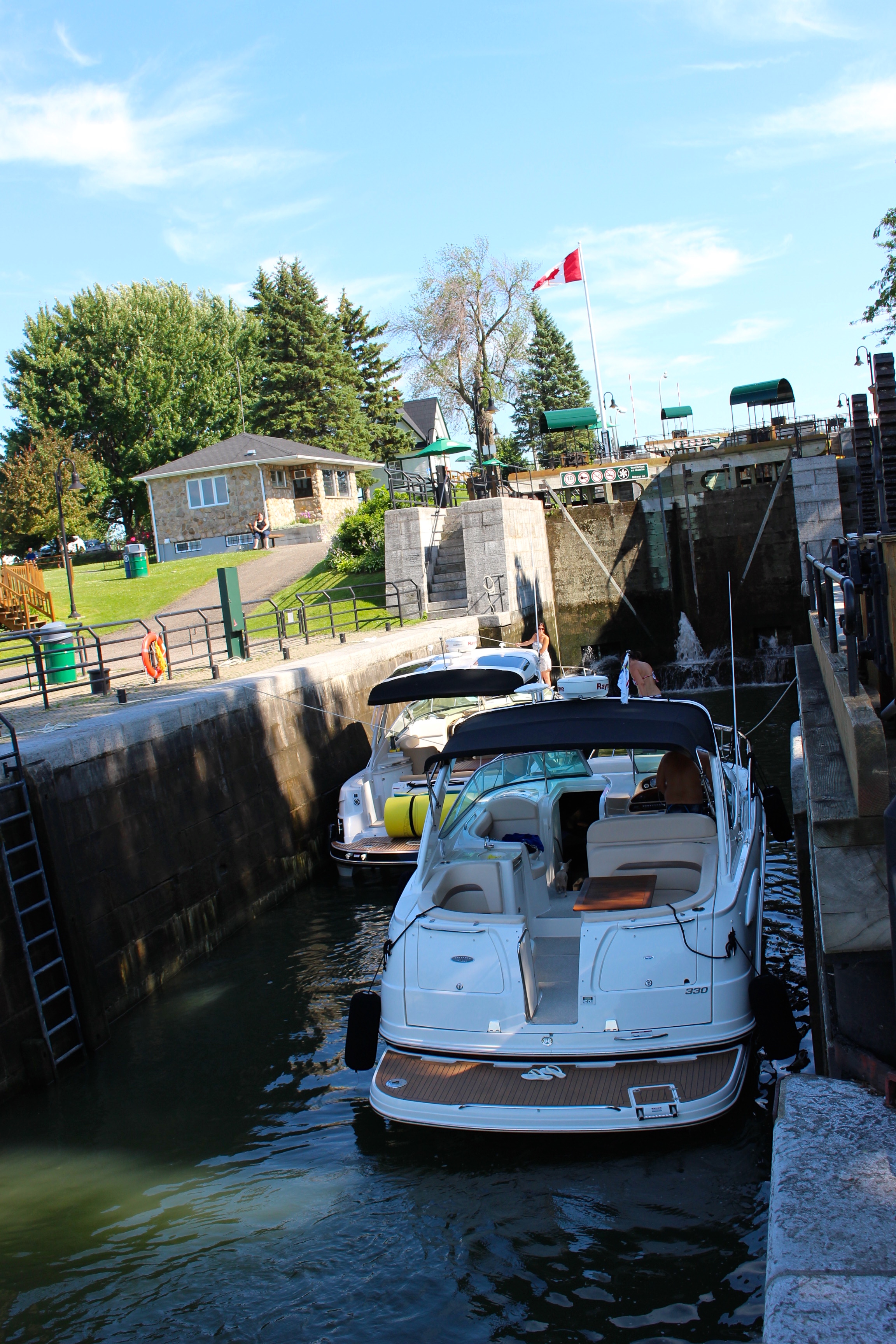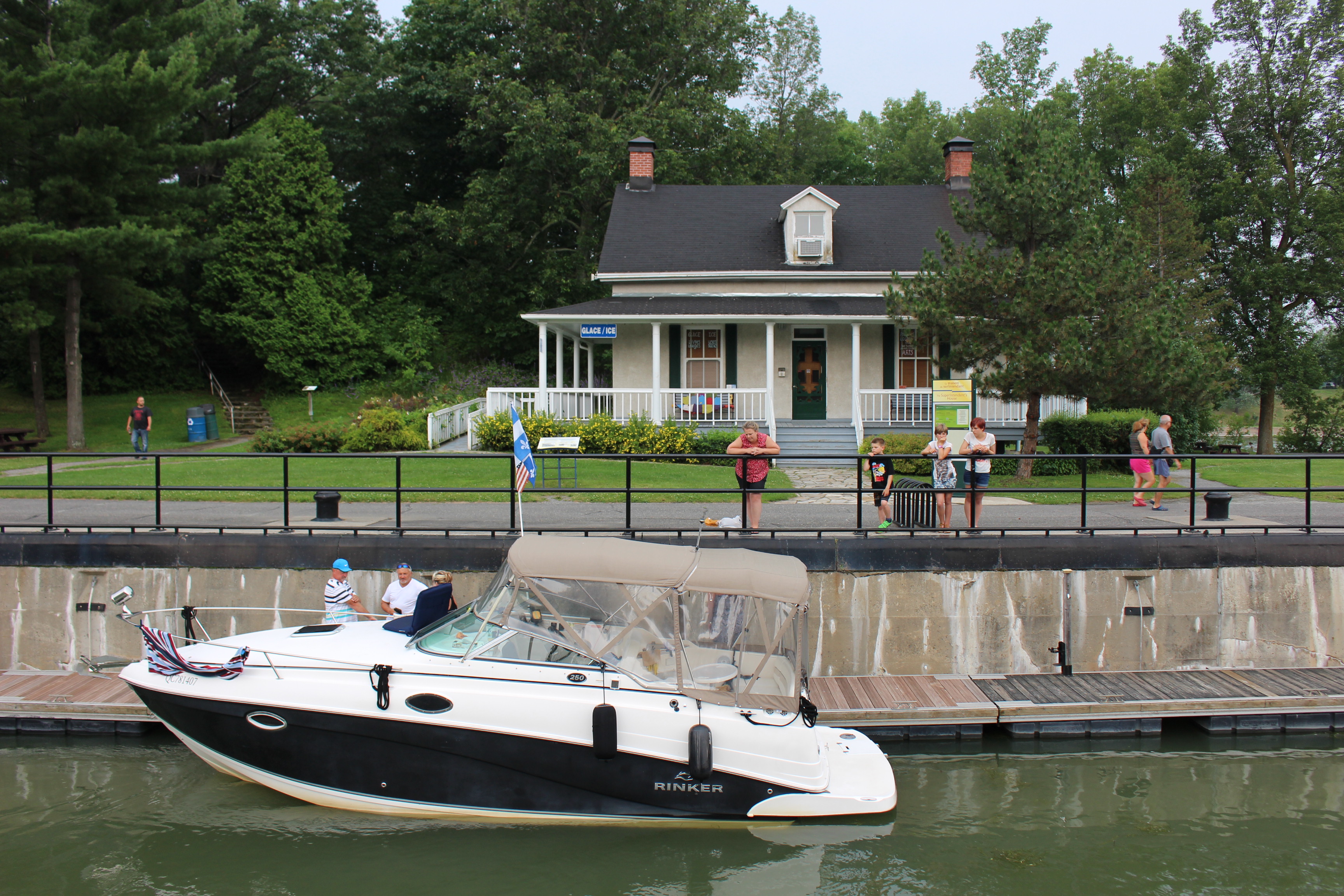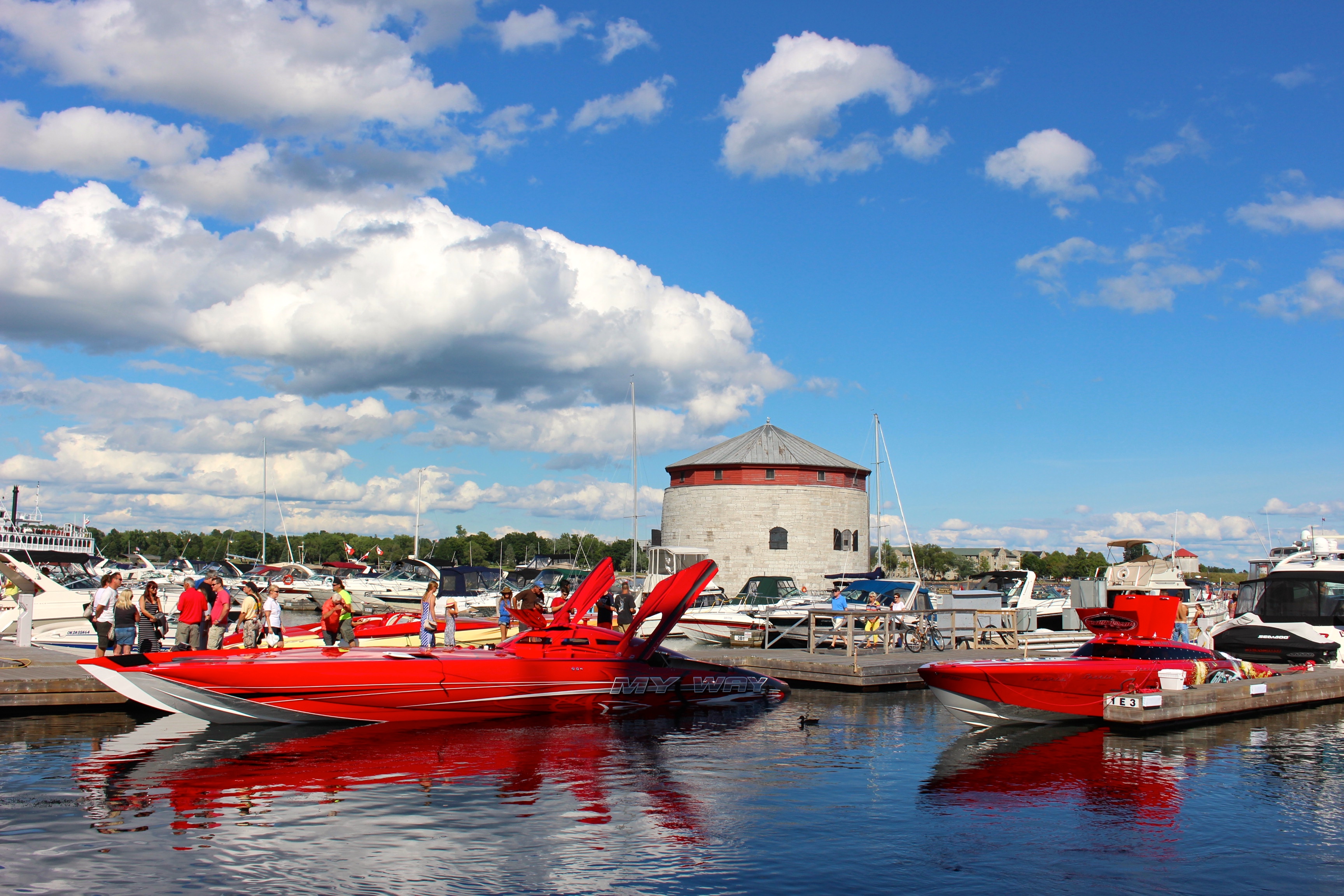 A Kingston, nous découvrons à la Marina une manifestation de « Power Boat ». Nous sommes estomaqués par la monstruosité de ces machines, une débauche d’argent. L’ambiance est rock-on-roll avec de jolies « Bimbos » se trémoussant le long des carrosseries reluisantes. Nous apprécions cet étrange spectacle et ressentons l’omniprésence américaine toute proche. En effet, de l’autre côté du fleuve, nous apercevons les côtes américaines…