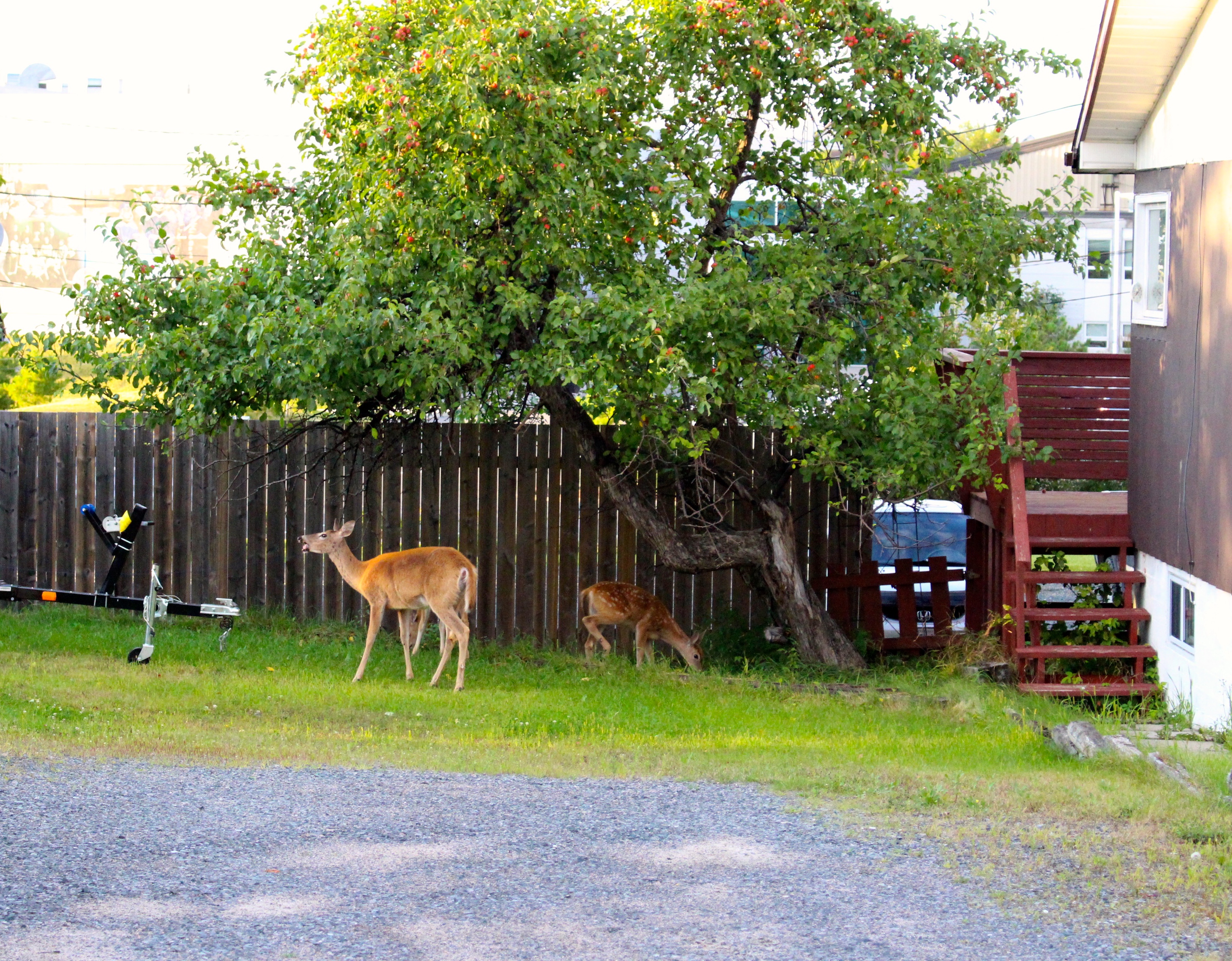 Alors que nous circulions dans les rues de Kenora notre attention a été attirée par un animal sauvage qui traverse la route, plus loin un deuxième… Deux pâtés de maison de plus et nous admirons même une mère et son petit ! La population s’accommode visiblement bien de cette présence insolite dans leur jardin ! La ville est petite, sans charme apparent, et tous les beaux emplacements sont malheureusement interdits aux camping-cars.