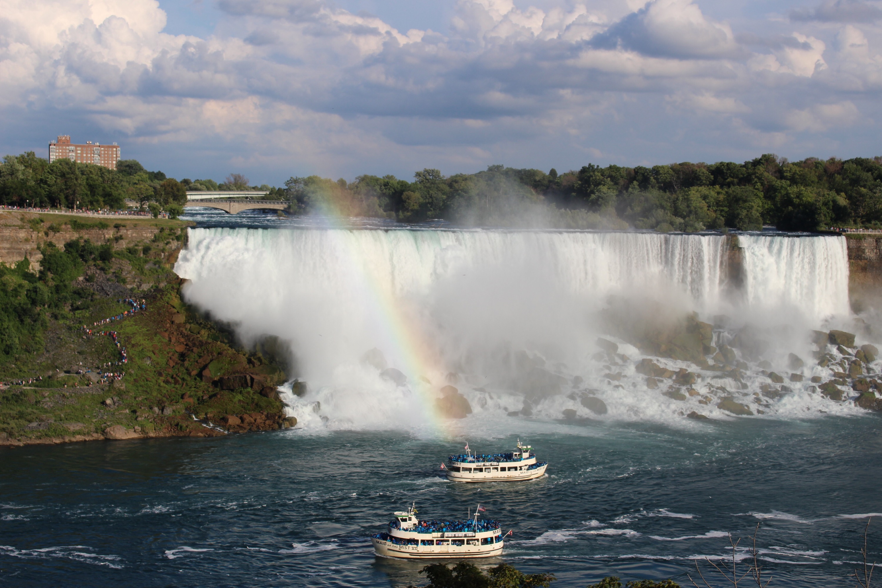 Pour nous, ce lieu touristique n’évoquait pas grand intérêt lorsque nous nous y sommes rendus ! Toutefois, une fois sur place, ce fut une agréable découverte tellement ces chutes offrent un splendide spectacle. Malgré des hordes de badauds venus du monde entier, nous restons ébloui pendant des heures devant ces miliers de litres d’eau qui se déversent à nos pieds… La chute canadienne en forme de fer à cheval est plus imposante par ces 260 mètres de largeur! L’américaine offre quant à elle de magnifiques arc-en-ciel au coucher du soleil. A voir au moins une fois dans sa vie…